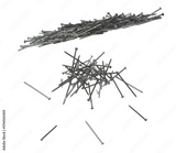 Long Nail fly floating in mid air. Many group new long nails metal fall as construction tools. Abstract long nails explode unbox. White background isolated high speed shutter freeze motion