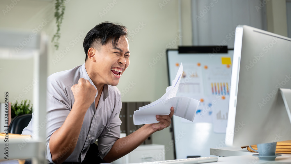 Excited asian businessman office worker looking at computer raised hands holding paper at work table
