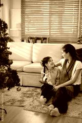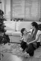 Happy mom spending quality time with her child, helping with holiday writing or homework near Christmas tree
