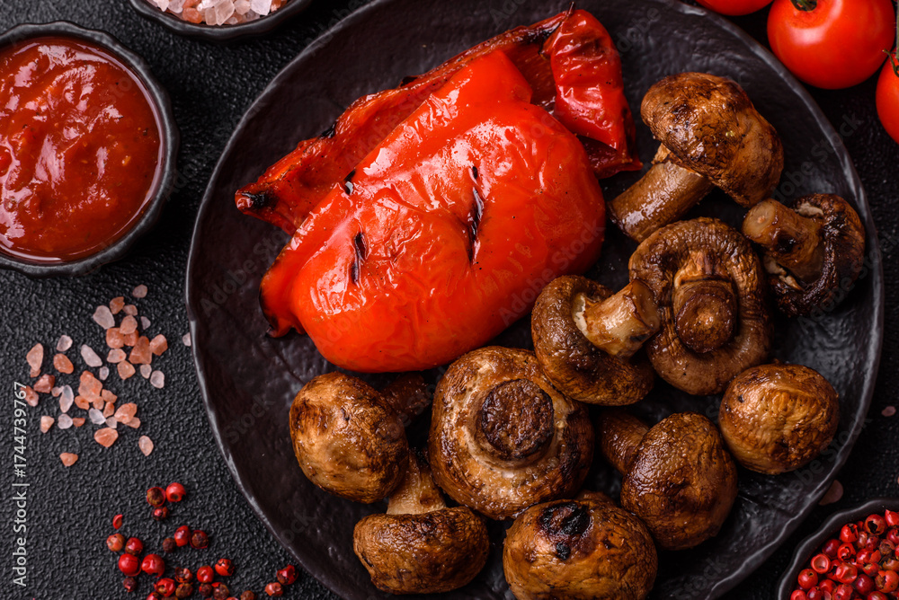 Grilled mushroom pieces, a vegetarian healthy meal with sauce. Barbecue mushroom halves