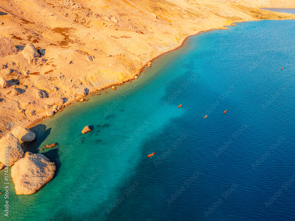 Rucica beach in Metajna with paddle board on Pag island curved shoreline, crystal-clear turquoise sea, sunlit barren terrain and rocky Adriatic sea