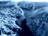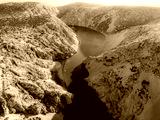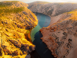 View of the Zrmanja River Canyon in Croatia, with winding turquoise waters cutting through limestone cliffs. A scenic natural wonder popular for kayaking and hiking