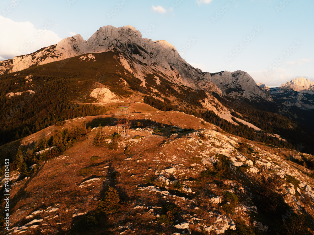 Sunset over Sutjeska National Park from Prijevor saddle, Bosnia and Herzegovina mountains with Bosanski Maglic the highest mountain in Bosnia and Herzegovina