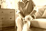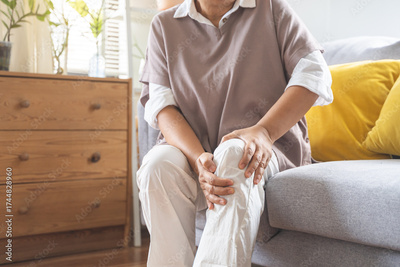 Body arthritis muscles stiff problem, aged woman suffering on leg, pain knee from disease chronic, hand massage rubbing joint injury, mature hurt or sore sitting on sofa at home. Health care people.