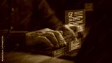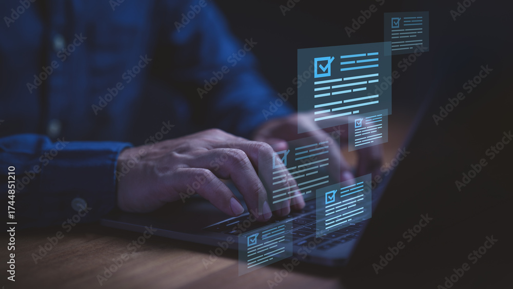 Businessman using laptop computer with glowing checklist documents and forms, symbolizing online survey, task management, workflow automation, electronic signature and digital productivity solutions.