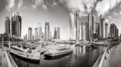 Panoramic view of Dubai Marina bay with yacht and cloudy sky, Dubai, UAE.