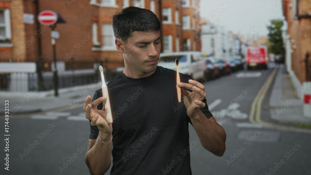 Man holding electric toothbrush and bamboo toothbrush while comparing oral care tools on street; sustainable hygiene curiosity.