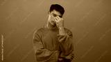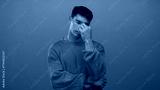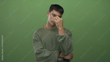 Young hispanic man pinches nose with free hand and crosses arms in green studio for stinky smell reaction; disgust.