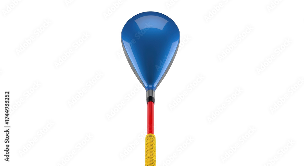 Isolated blue golf club driver with red shaft and yellow grip for driving range sports