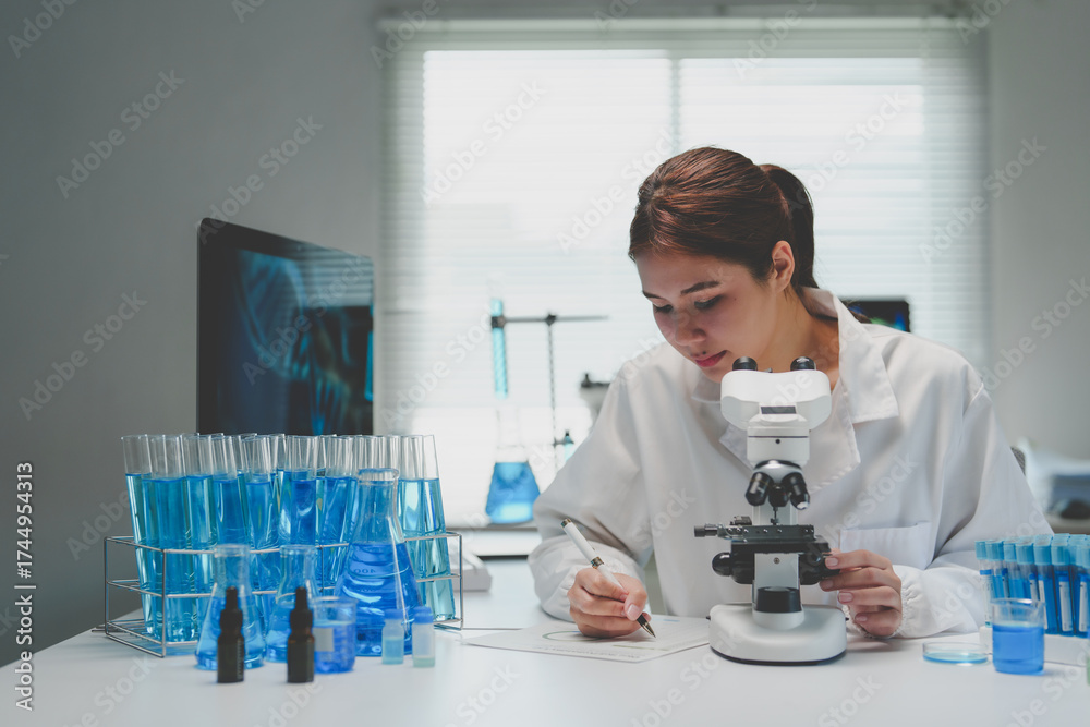Young woman scientist examining samples, writing notes