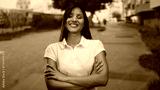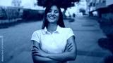Woman smiling confidently on a vibrant urban street, arms crossed, featuring a colorful graffitied wall and bright daylight, dressed casually in a white shirt outdoors.