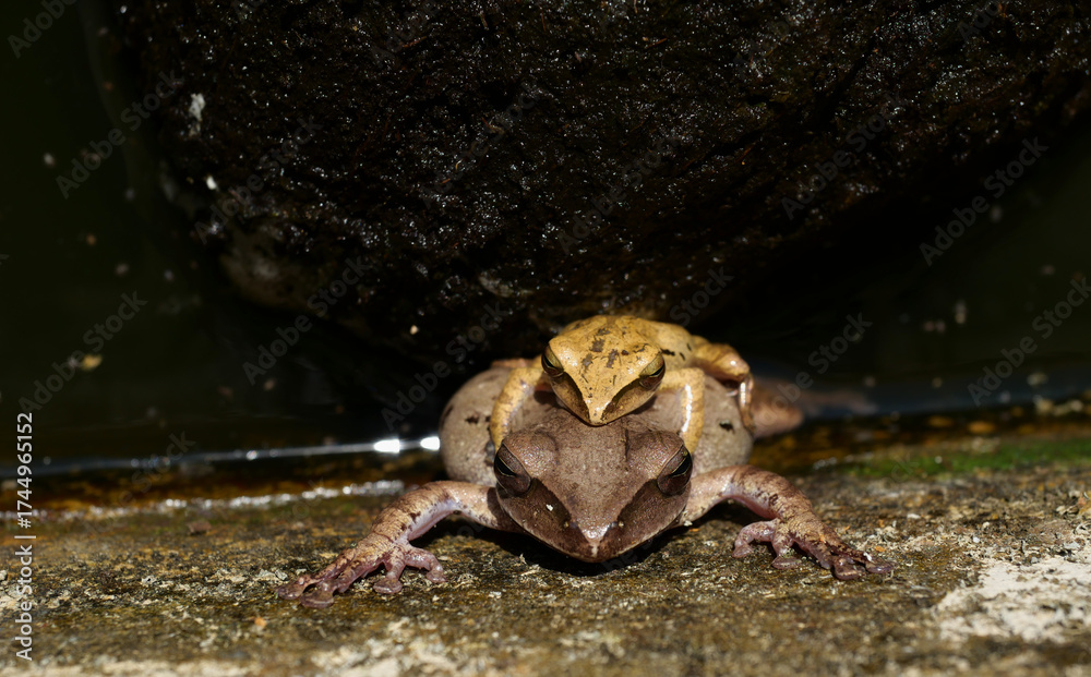 Frogs are mating on water , Amphibians in tropical Asia , Local creature in Thailand , Reproductive system of animal , Common tree frog breeding by the male is hugged on the female back