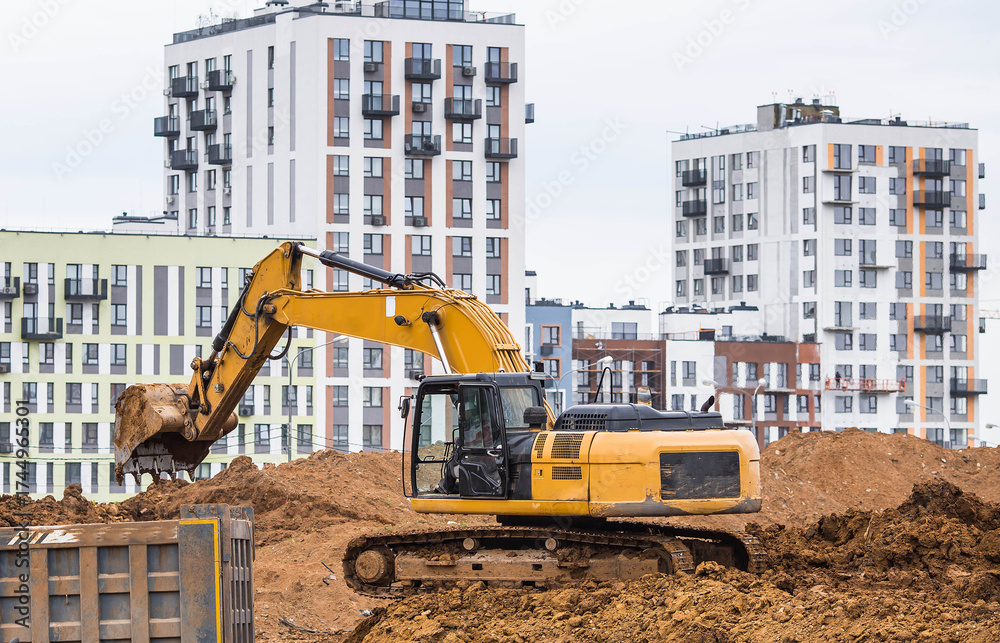 An excavator is digging the ground with a bucket. Close-up of an excavator on a construction site. Heavy machinery for construction and landscape design.