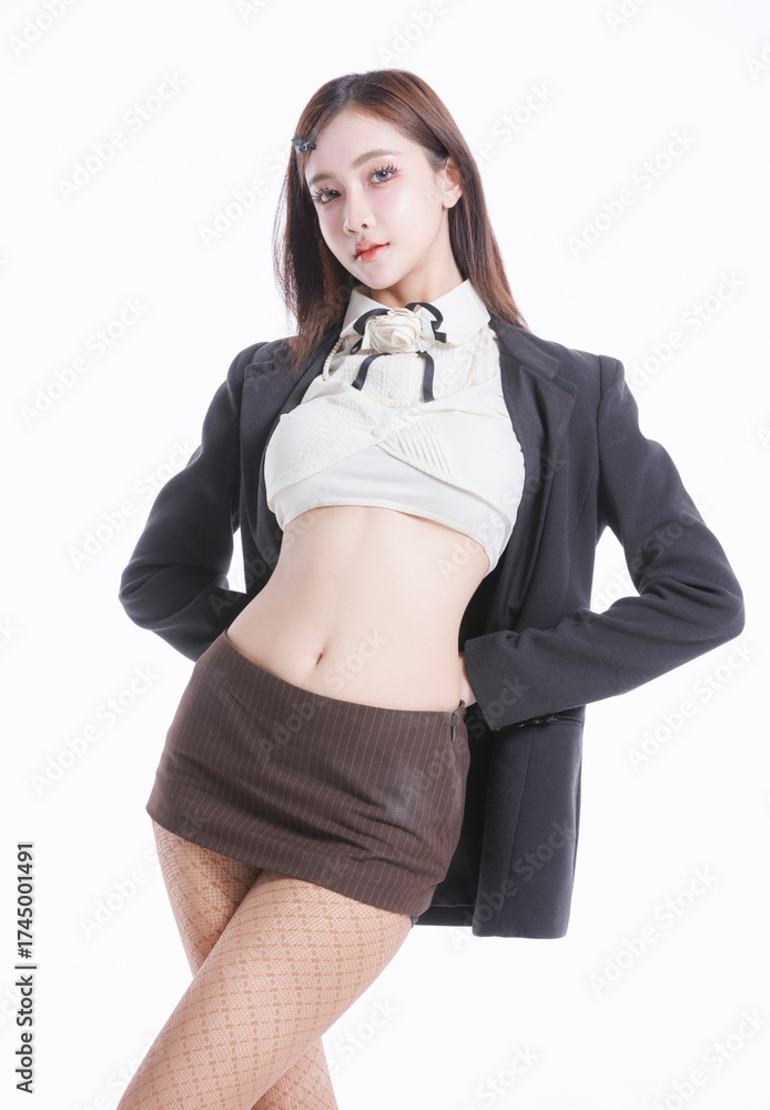 Profile portrait asian pretty young woman model beautiful slender body attractive confident in trendy costume standing posing showing in white studio background, fashion stylish concept.