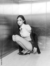Asian fashion portrait of elegant young beautiful woman in modern business attire sitting posing in elevator, wearing blazer, crop top, shorts, fishnet tights, expressing confidence, glamour concept.