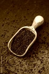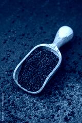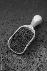 Wooden scoop filled with black sesame seeds on dark background