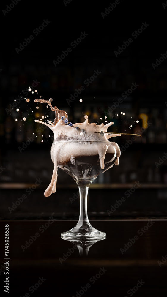 Brown foamy cocktail splash in bar interior with lavender garnish. Concept of nightlife, elegance, and creativity for beverage branding, social media, and HoReCa design.
