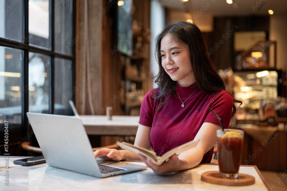 Asian woman holding notebook and looking at a laptop aside coffee while sitting at table in a cafe.