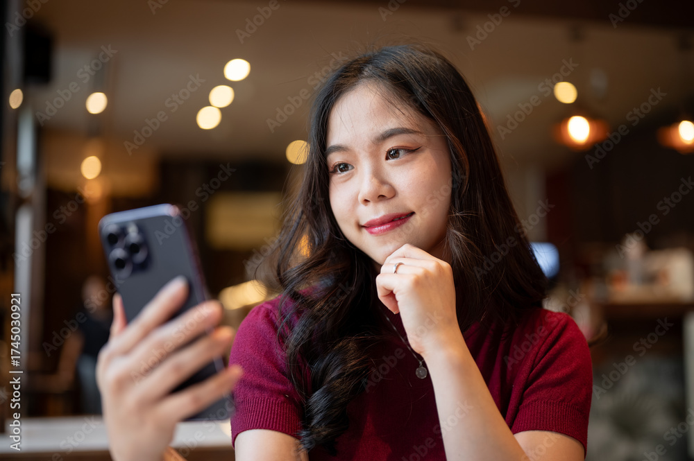 Close up pretty asian woman holding looking at smartphone resting head on hand while sitting in cafe
