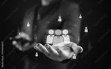 Customer Relationship Management system with businessperson holding virtual people icons, representing digital customer network, online communication, and connection in corporate marketing.
