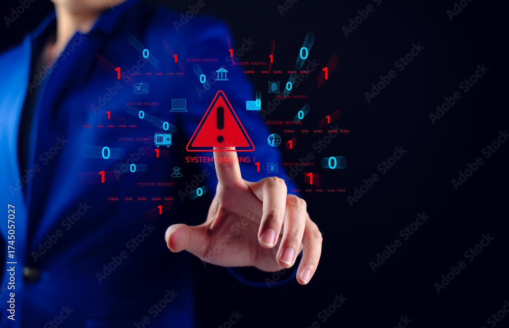 Cyberattack warning concept featuring a hand reaching toward digital red alert, symbolizing system hacked, data breach risk, and cybersecurity threats in modern technology.