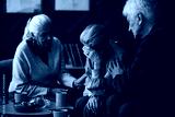 Three senior Caucasian people comforting each other, two women and one man sitting together, one woman covering face with hand while others offering support and empathy in bereavement or grief