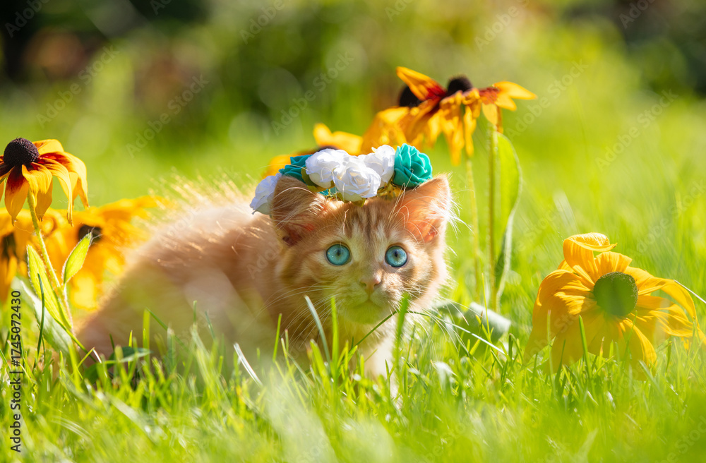A kitten outdoors in summer. Portrait of a cute, funny kitten wearing a wreath. The kitten sits on the grass in summer