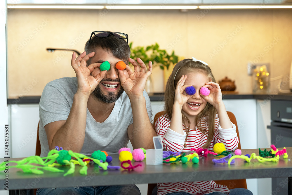 Happy family father and little daughter fun play and laugh creating craft from colored chenille wire. Diy. Leisure with children