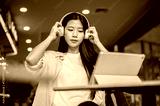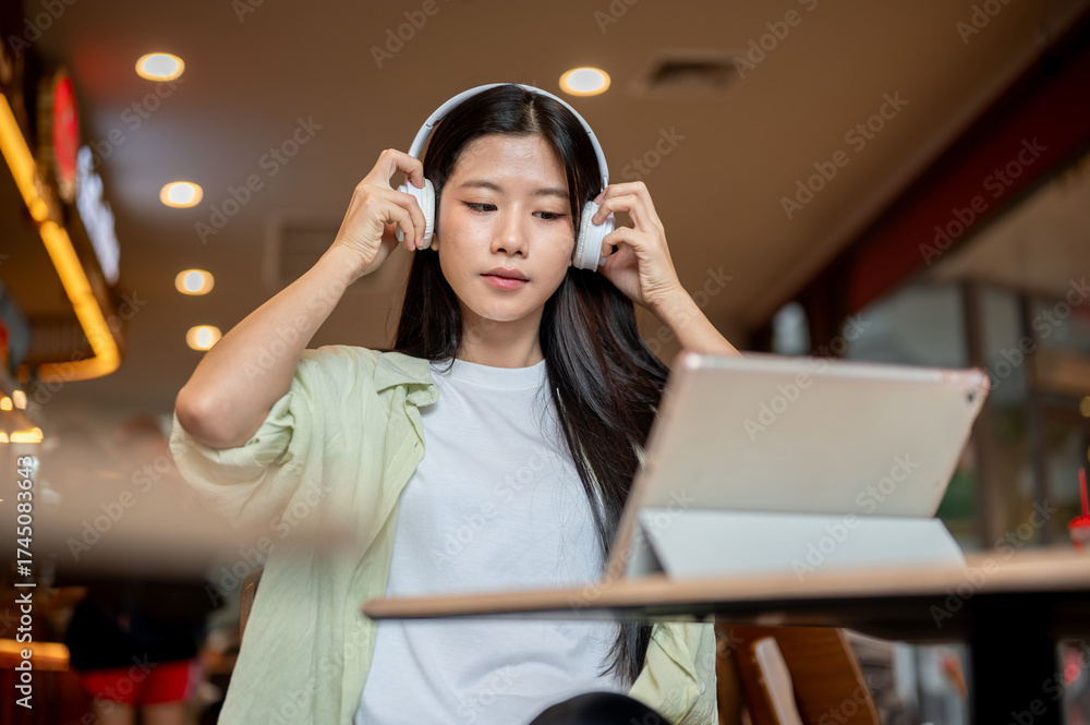 Pretty asian woman student wearing headphones while looking at tablet on wooden table in the cafe.