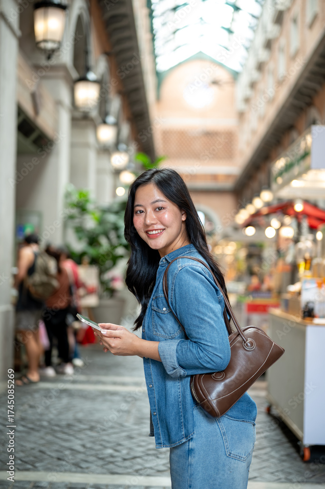 Smiling asian woman in denim holding phone while standing sideway in shopping mall or indoor market.