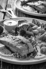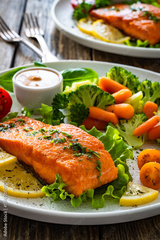 Fried salmon steak with boiled broccoli and mini carrots and sauce on wooden table