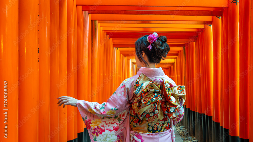 Asian women in traditional japanese kimonos at Fushimi Inari Shrine in Kyoto, Japan.