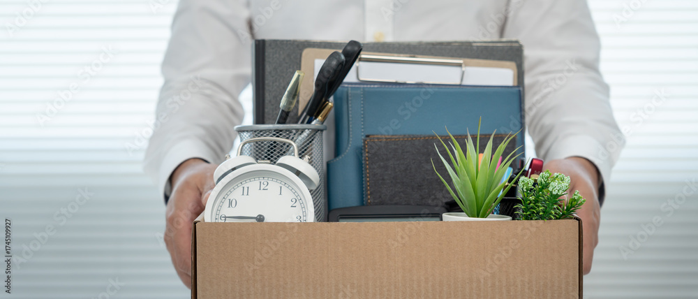 Stressful businessmen will resign from the company. lifting a brown paper box that holds personal items. resignation, job placement and vacancies concept.