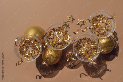 Champagne glass with party serpentine streamers, balloons and golden confetti stars top view. New Year, Christmas, birthday or wedding festive template.