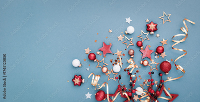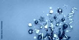 Christmas and New Year holiday background from festive decoration balls on blue top view. Xmas ornament composition for greeting card.