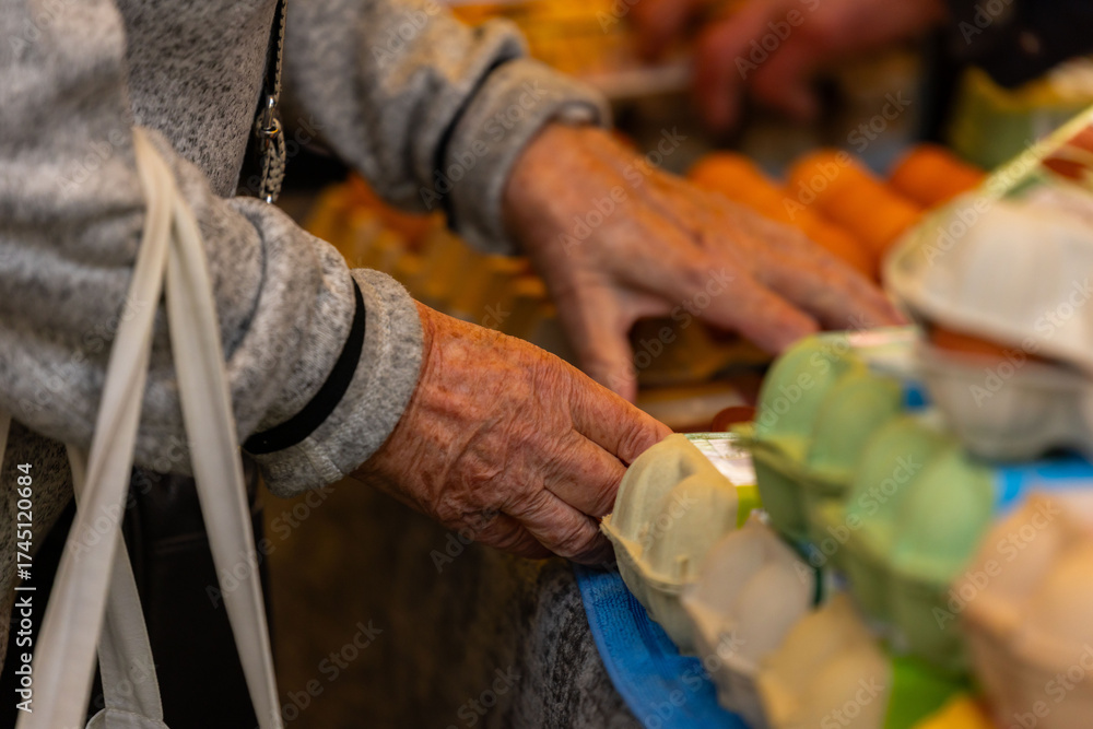 Elderly caucasian female shopping for eggs at market stalls