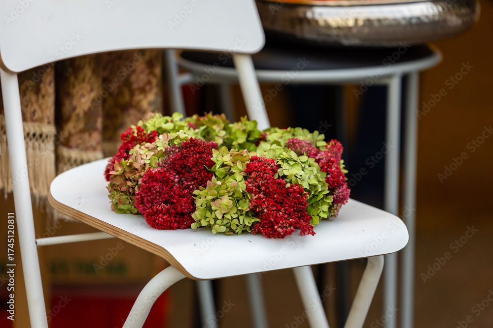Colorful hydrangea and red flower arrangement on white chair in cozy setting