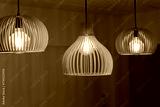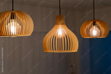 Modern wooden pendant ceiling lamps glowing with warm light bulbs interior decoration for cozy living design
