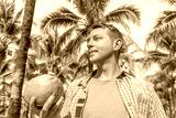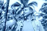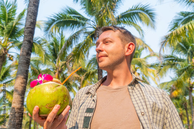 Man holding fresh coconut drink with orchid garnish in a lush coconut grove in Chiang Mai, Thailand, enjoying tropical nature and refreshment. Mindful travel, sustainable tourism, tropical vacation