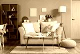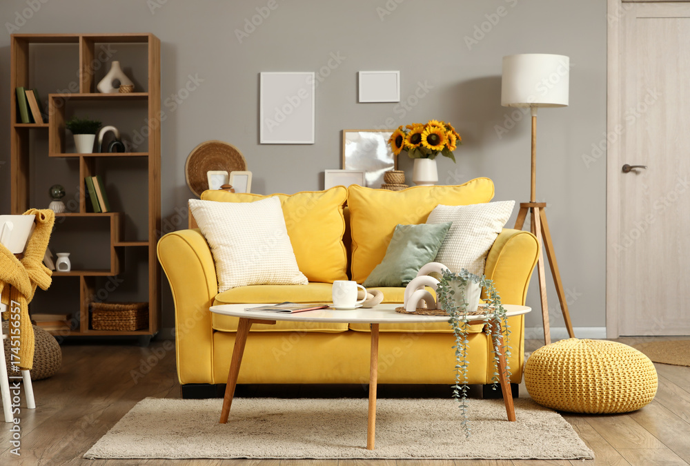 Interior of stylish living room with yellow sofa and artificial houseplant on coffee table