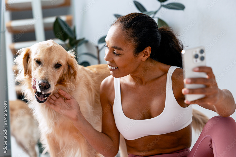 Woman and golden retriever dog taking selfie