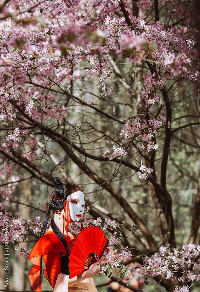 A woman wearing a Japanese mask on her face, traditional clothing, and a fan in her hand, surrounded by cherry blossoms. The portrait symbolizes the traditions and culture of the Japanese people.
