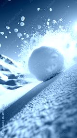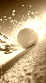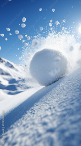 Large snowball rolling downhill on a sunny snowy mountain slope with flying snowflakes.