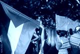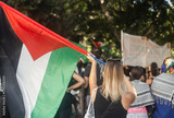 Young caucasian woman protest at free Palestine demonstration - Solidarity and march against genocide concept - Focus on flag