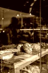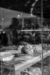 A display window of a local bakery or cafe, filled with fresh artisanal bread. Reflections of the city street are on the glass, a concept of small business and traditional baking.