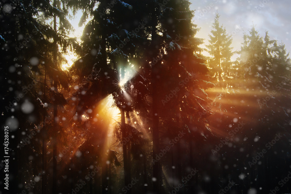 SonnenStrahlen durch den Wald im Winter