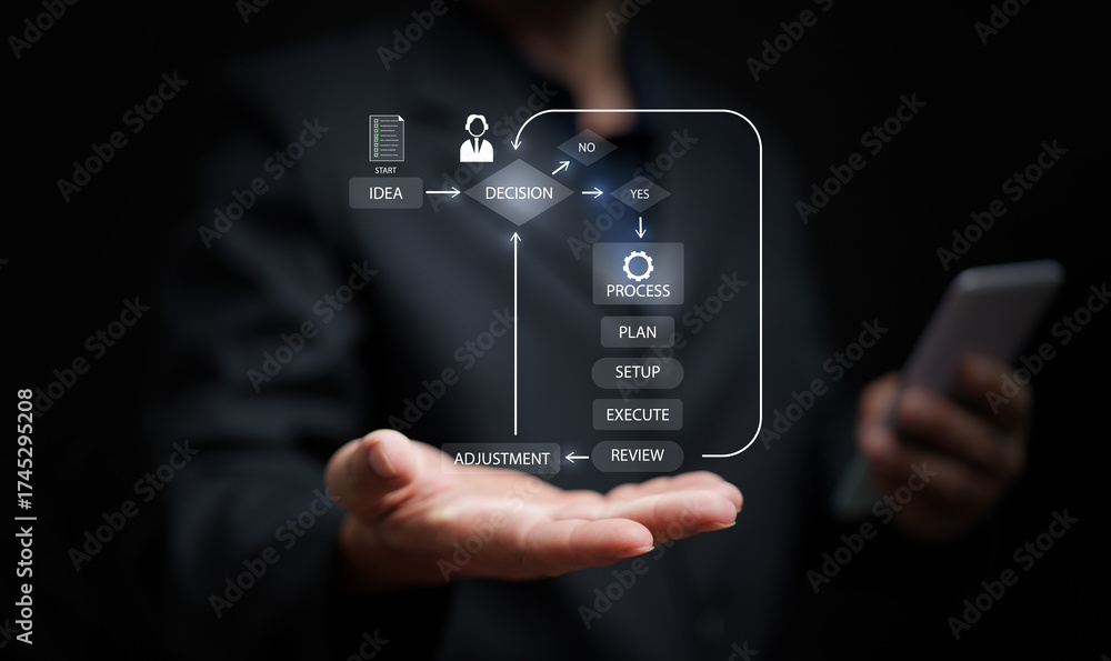 Modern business workflow concept showing digital process management, idea to execution, with strategy planning and review cycle on virtual interface for corporate innovation productivity.