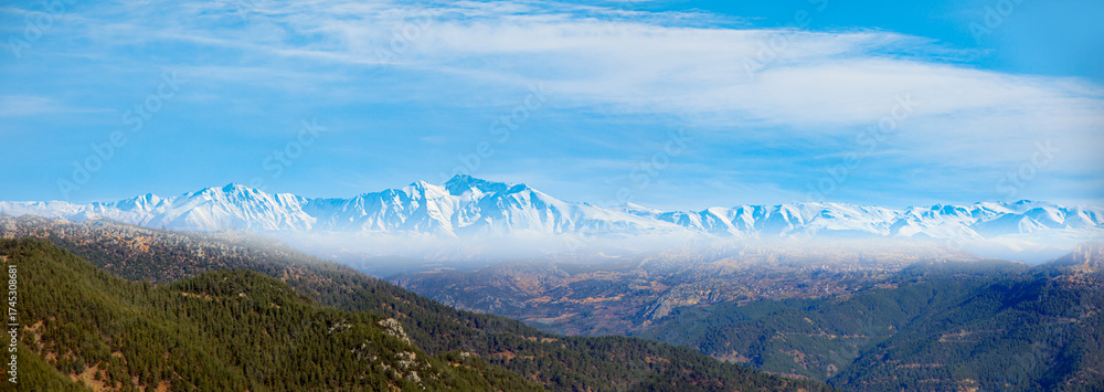 View of the snowy mountains of the Eastern Taurus from the road Tarsus, Mersin