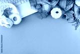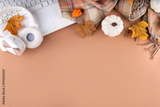Cozy autumn background with laptop, fall leaves, pumpkins and plaid. Autumn office work, education flat lay top view copy space. Woman person hands using laptop computer from above on beige background