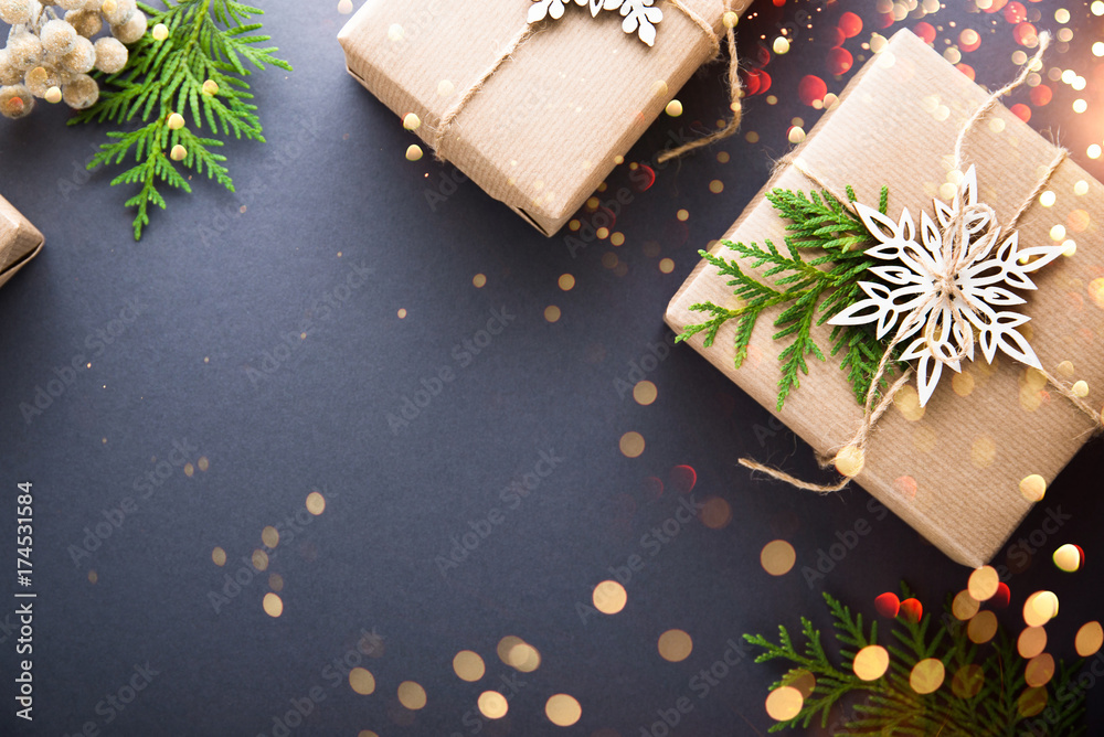 Christmas handmade gift boxes craft paper decorated on dark background top view. Merry christmas greeting card, frame. Winter xmas holiday theme. Happy New Year. Flat lay. Twinkle glitter bokeh light